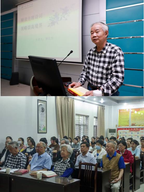 随后,由离退休工作处副处长张忠红主持了读书分享活动。师生们聆听了曾孔生老教授以“精读主席诗词,领略崇高境界”为主题的毛泽东诗词讲座。曾孔生教授今年已82岁高龄了,1968年毕业于华中师范大学文学院汉语言文学专业,中华中医药学会医古文研究专业委员会常务委员,十堰市语言学会副会长,在诗词格律上有较高修养。他怀着对毛主席无限崇敬的心情来做这次讲座,提前认真备课制做PPT,还亲自为《七律.长沙》作画。讲授中,他激情澎湃,声情并茂、图文并存,让师生们领略了毛主席诗词中的以天下为己任、不怕吃苦、胸怀天下等伟大精神境界,又从语言文学的角度赏析了毛主席诗词的艺术魅力。