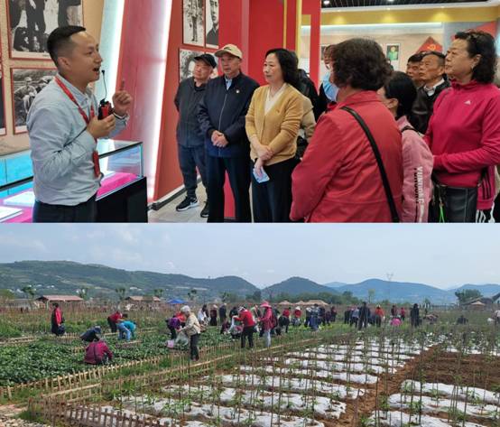 随后展开一系列参观考察实践活动。离退休老同志们来到郧阳区龙韵村文化艺术村“龙韵共享生态农场”,欣赏春日美景,体验田园生活,采摘有机蔬菜,感受乡村田园气息。